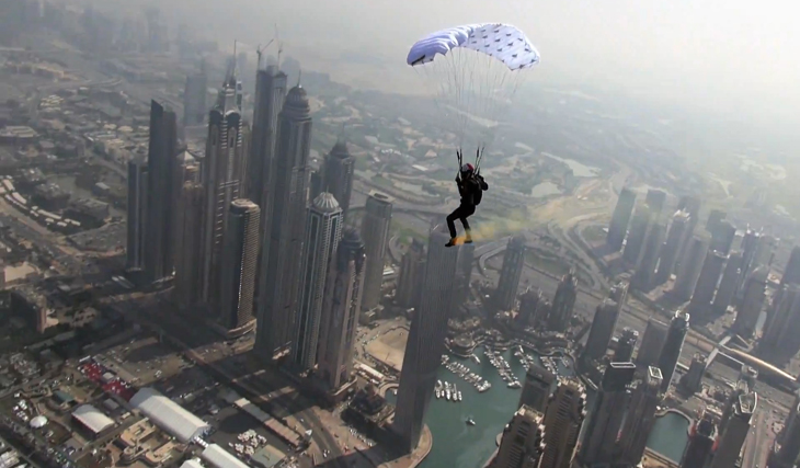 El venezolano Ernesto Gainza saltó desde una altura de más de 4 kilómetros con un paracaídas ridículamente pequeño de apenas 3 metros cuadrados (acostumbran a medir más del doble). El 7 de abril de 2014 el sudamericano decidió buscar los límites de la resistencia de un paracaídas en un escenario espectacular: la Palm Jumeirah, uno de los archipiélagos artificiales de Dubai, en Emiratos Árabes Unidos. Para evitar que la velocidad de su cuerpo rompiera el paracaídas, Gainza abrió la tela justo después de saltar del avión y consiguió aterrizar sin problemas.