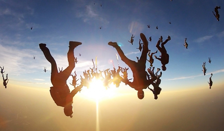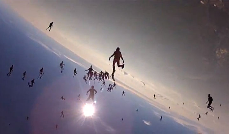 Un centenar de paracaidistas muy experimentados realizaron una de las figuras más espectaculares jamás vistas. En julio de 2007 en Florida (EE.UU.), se congregaron algunos de los mejores deportistas de esta disciplina procedentes de 18 países distintos para llevar a cabo esta acrobacia. El riesgo resulta obvio, ya que la extrema proximidad entre los paracaídas podría provocar un efecto en cadena de consecuencias impredecibles. Por fortuna todo salió bien y dejaron una de las imágenes más hermosas que se recuerdan en los cielos. Recomendamos que vean el vídeo: matrícula de honor en sincronización.